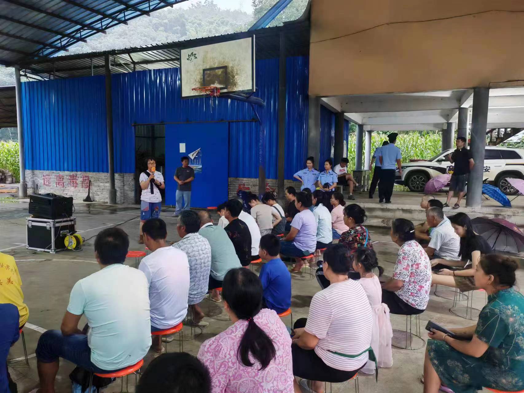 活动伊始,县委宣传部农村电影放映队播放了《民法典》宣传纪录片和缉毒影片《毒影迷踪》。村民们专注地观看影片,为缉毒警察担心的同时也痛恨毒枭的无情。播放结束后,派出所民警向旁听群众深入宣讲了常见基本民事法律关系、法定结婚年龄、毒品的危害等法律知识并发放普法宣传资料100余份。普法工作组队员结合第四轮下沉普法重点,向群众讲解了防网络电信诈骗、早婚早育的危害、预防未成年人犯罪、防汛救灾、缉枪治爆、命案防控等知识。